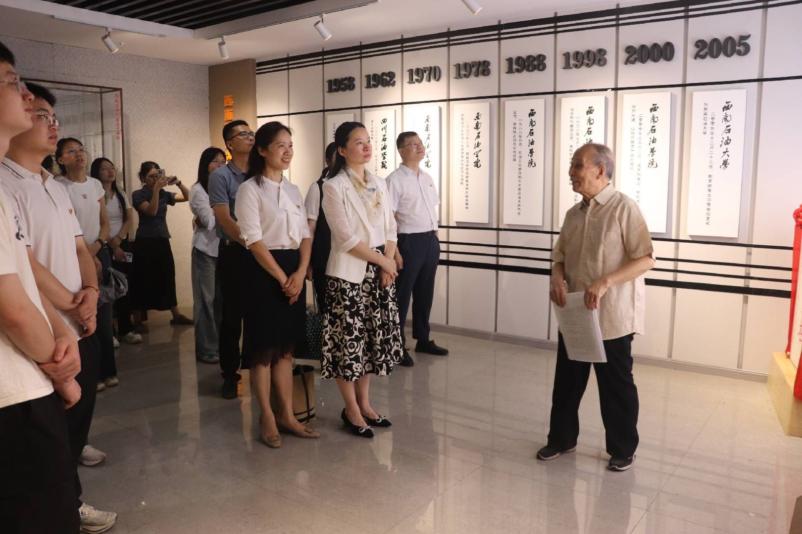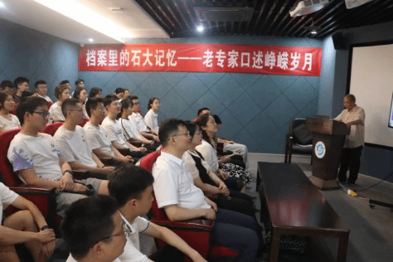 支部成员在校史馆开启“寻根之旅”。在张明洪教授深情讲述下,陈列的泛黄文件、陈旧仪器不再是冰冷的物件,而成为历史的“发声者”。张明洪教授动情回顾了学校建校之初先招生后建校、边教学边劳动、在实验室里日夜坚守、为攻克能源技术难关不畏艰难勇攀高峰的感人故事。“能源报国是刻在石大人骨血里的信念”,老校友的话语铿锵有力,传递着代代石大人矢志不渝的精神接力,让在场的年轻党员深刻领悟到先辈们的赤诚初心与使命担当。