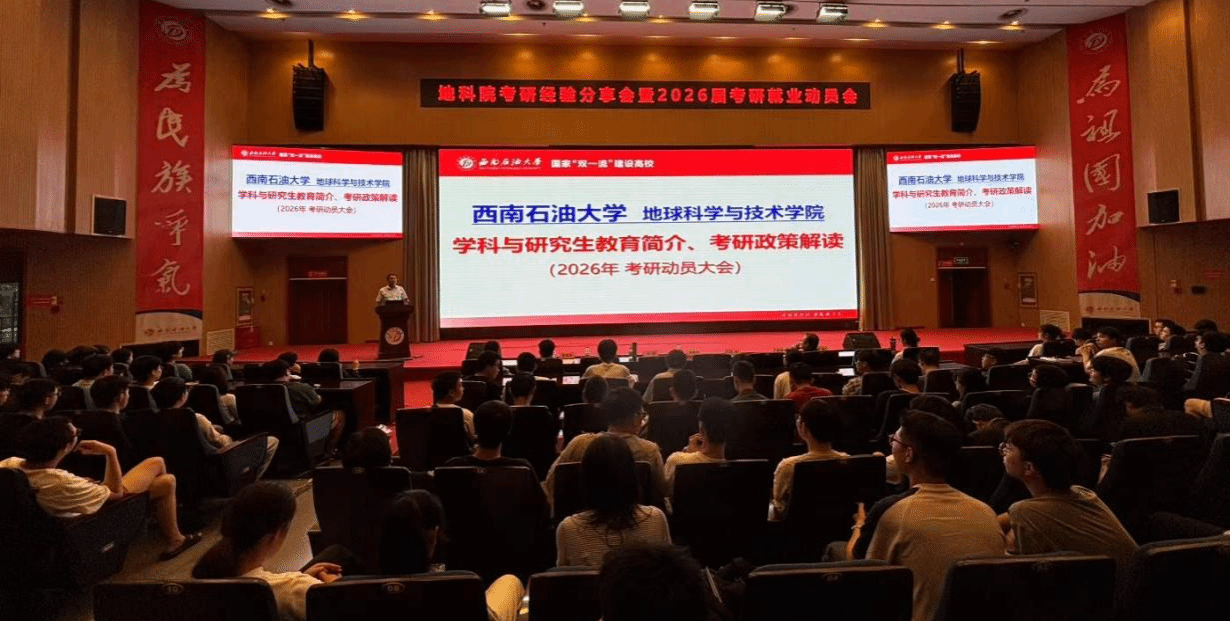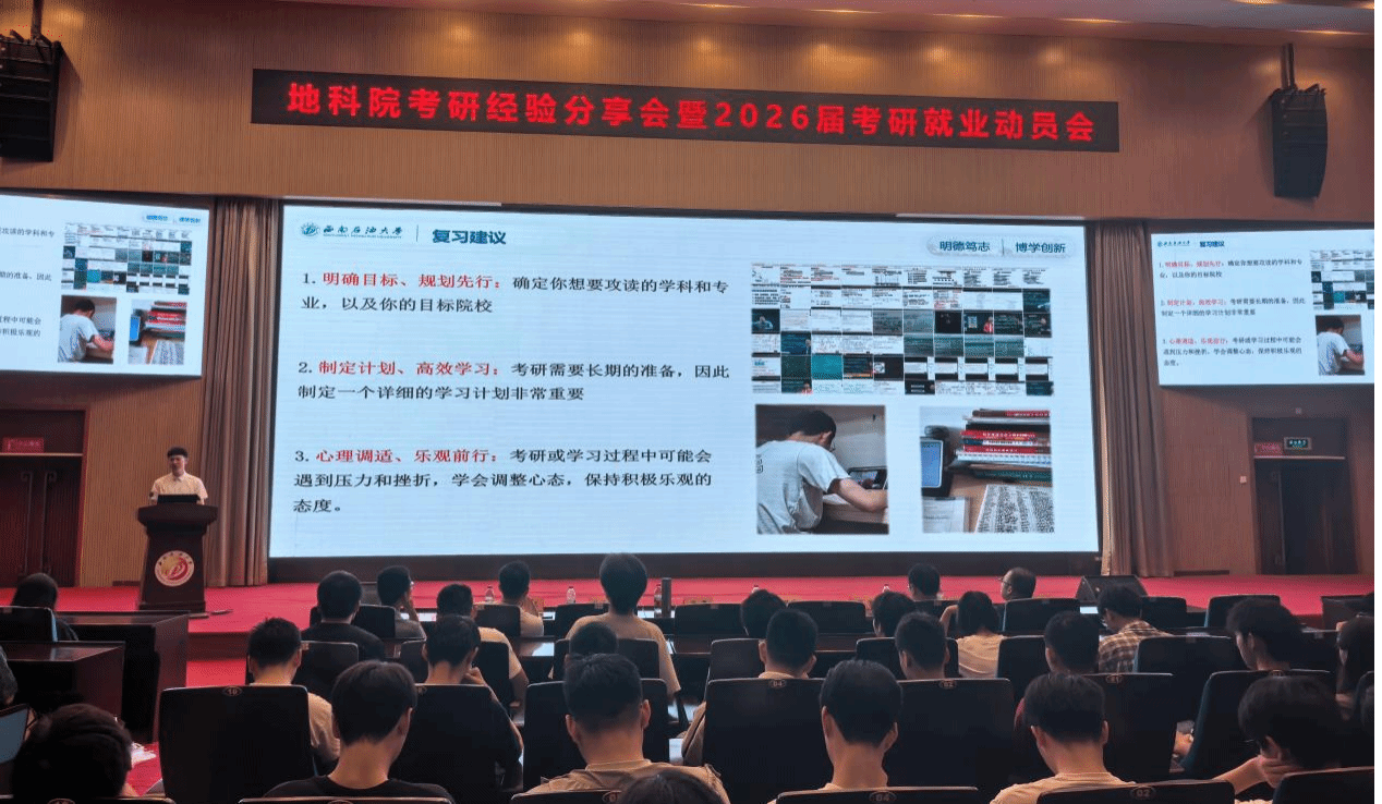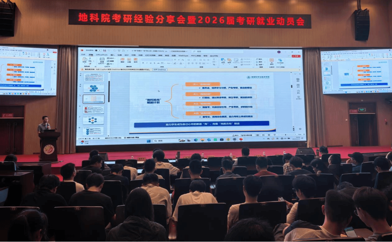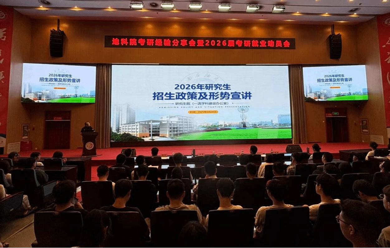 6月24日15点,地科院在图书馆学术报告厅举办“研途领航,职启新程”主题考研经验分享会暨2026届考研就业动员会。地科院党委书记赵晓明、党委副书记兼纪委书记张勇、副院长刘宏、学校研招办主任高俊平、辅导员程鑫、刘肖和全体2026届毕业生参加此次动员会,同时邀请家长们线上参会。旨在为面临考研就业抉择的同学提供指导。