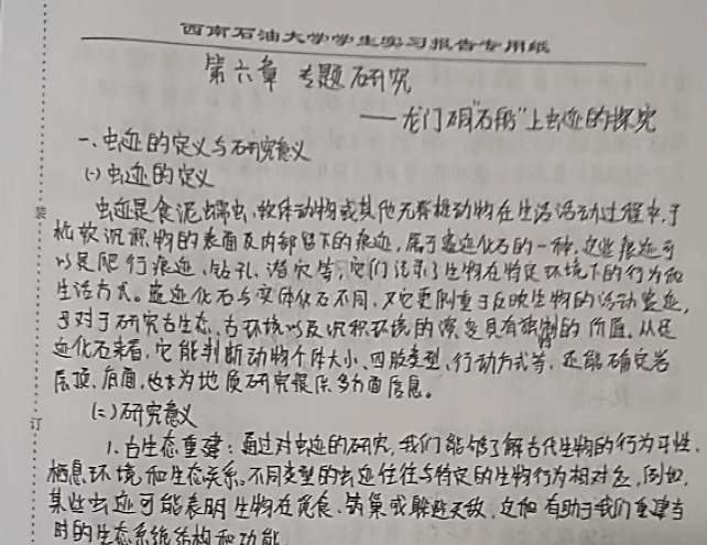 深化实习报告改革,启蒙学生科研素养:不同于传统实习报告,本次地质学专业的地质实习报告撰写环节中创新性地增设“专题研究”章节,大胆鼓励学生根据个人兴趣,聚焦实习中遇到的某一具体地质现象或科学问题(如特定剖面的沉积环境演化、典型构造的形成机制等),进行野外观察、文献调研和综合分析,自主完成独具个人特色的“专题研究”。这不仅锻炼了学生的科研思维和独立研究能力,也使实习成果更具深度和价值。从实习报告来看,实习学生的专题研究广泛,内容涉及峨眉山玄武岩地质特征及成因、峨眉实习中的风化作用、白云岩“刀砍纹”成因探究等,体现了学生在实习过程中的独立思考,一定程度上启蒙了学生的科研素养。
