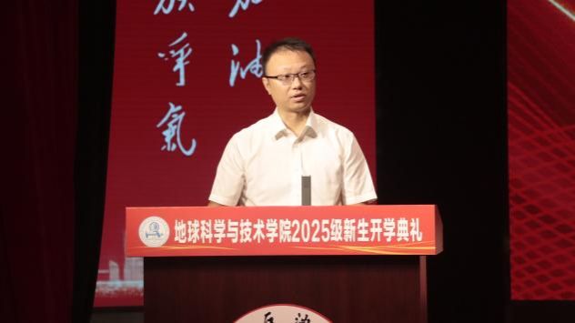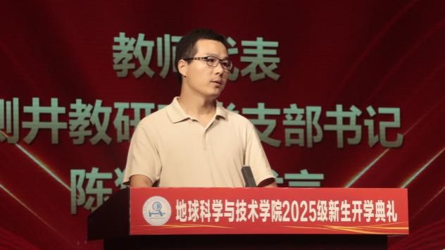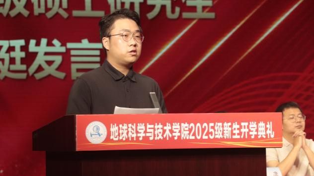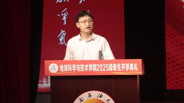 地科院测井教研室党支部书记陈猛作为教师代表发言。他将 “铸指南针之‘志’、秉放大镜之‘精’、持地质锤之‘实’、炼登山靴之‘韧’” 作为重要指引,鼓励新生涵养胸怀家国的格局、锤炼勤思善学的本领、坚守求真务实的作风、怀揣懂得感恩的心意,更提醒同学们在大学时光里兼顾学习与生活,让地科院的求学之旅,成为人生中难以替代的宝贵财富。