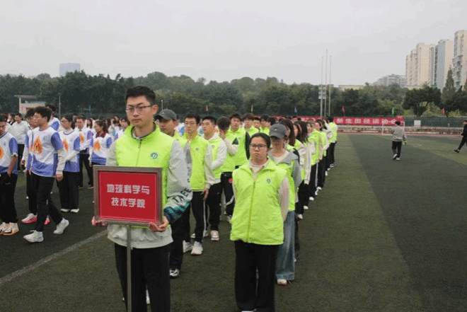 各学院代表队依次入场,而地科院代表队的亮相格外引人注目——队员们身着印有“大地无垠 格物致知”院训的队服,身姿挺拔如松,眼神中满是蓬勃朝气。整齐的队列、昂扬的姿态,不仅展现出地科学子的精神风貌,更传递出“敢闯敢拼、勇争第一”的信念,赢得现场观众阵阵掌声。