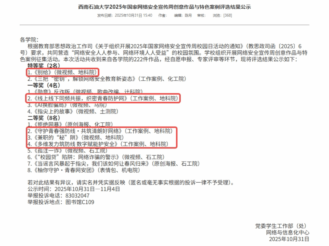 近日,西南石油大学 2025 年国家网络安全宣传周创意作品与特色案例评选结果公示落下帷幕。我院学子凭借扎实的专业积累、创新的表达形式和深刻的主题呈现,在全校 222 件参赛作品中脱颖而出,一举斩获 1 项特等奖、1 项一等奖、3 项二等奖,成绩斐然!