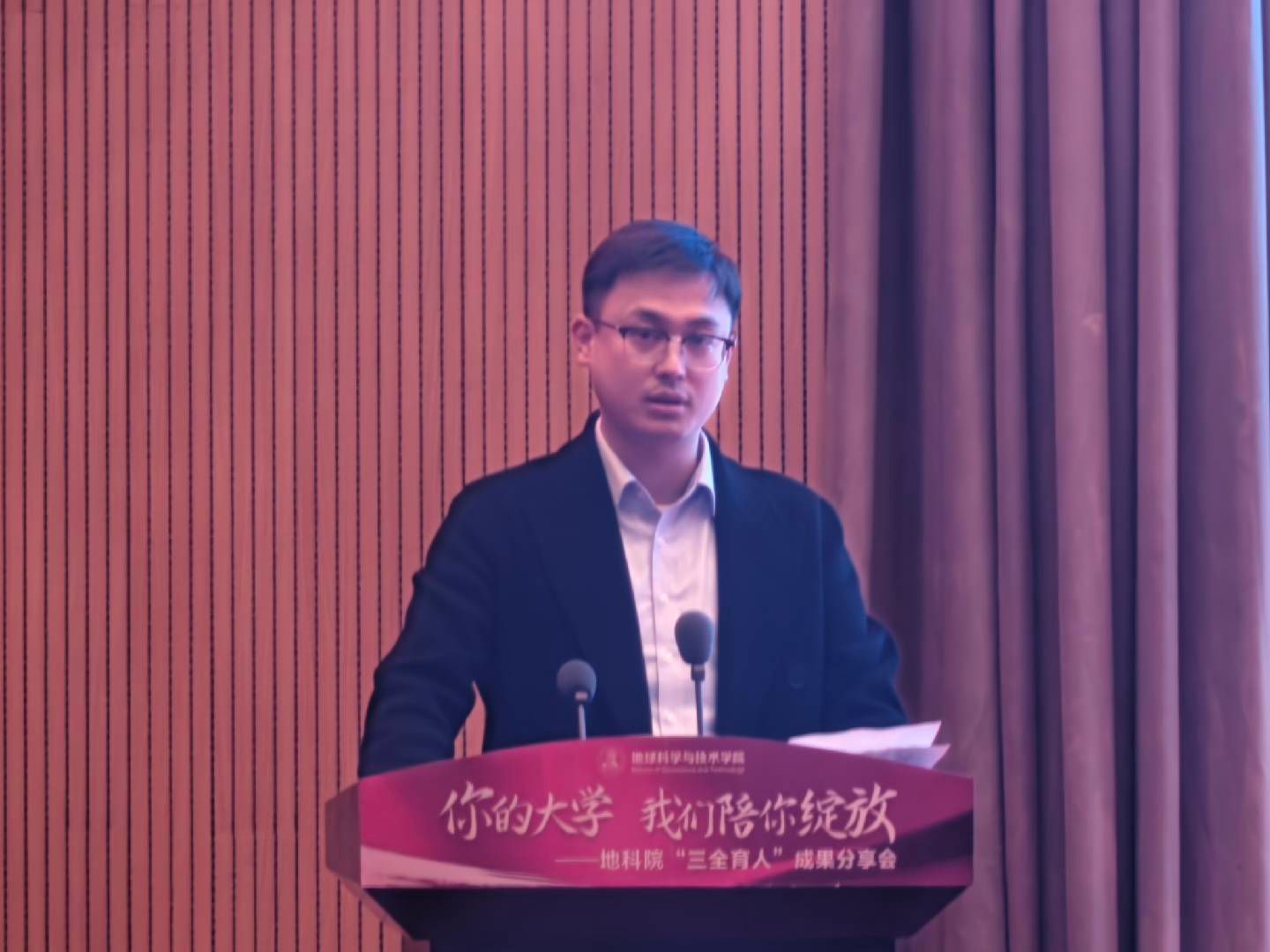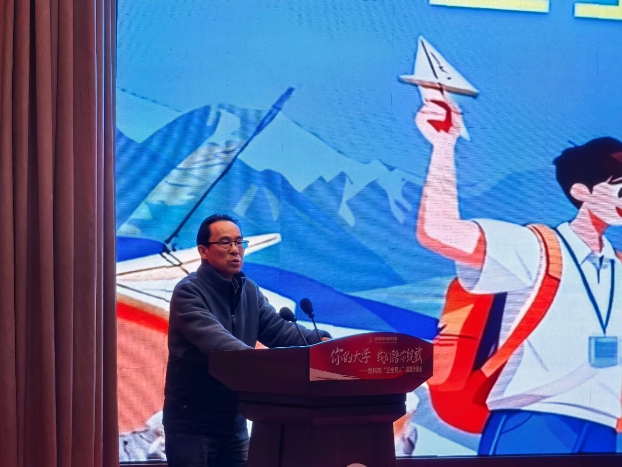 地科院院长赵晓明发表欢迎致辞。他代表学院对莅临现场的嘉宾、师生及校友表示热烈欢迎,结合学院发展历程与育人成果,深刻阐释“三全育人”理念的核心要义,勉励新生们以院为家、以地质为荣,在探索地球奥秘的征程中书写青春华章。