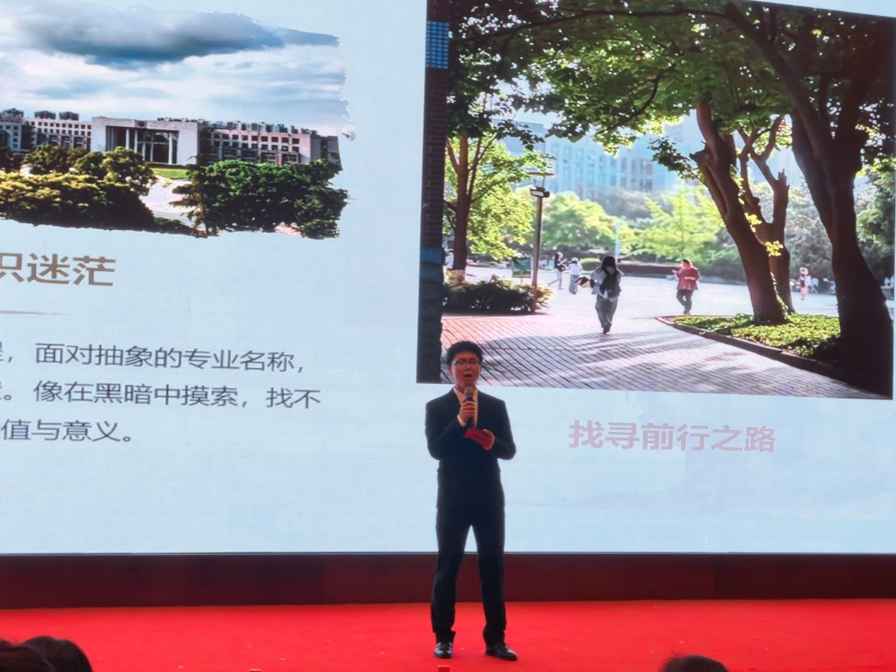青年教师吴昊结合自身研究经历,用生动案例讲述学科知识在城市发展中的应用价值,引导同学们搭建专业学习与社会需求的联结桥梁;地科院教授委员会主任王兴志从学科发展前景、专业优势特色出发,以详实数据与深厚行业情怀,帮助新生筑牢专业认同,坚定投身地质事业的信念;2025 级辅导员刘杨洁雅以《做有“方向感”的追光者》为题,精准破解新生角色转换、自主学习中的适应痛点,从学业规划、方法优化、心态调节三方面给出可落地的成长建议,用“方向比努力更重要,坚持比天赋更可贵”的寄语传递温暖与力量。