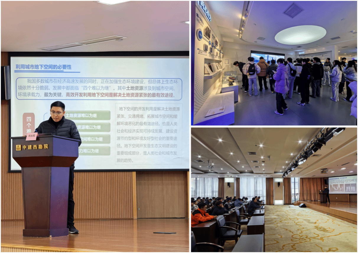 12月4日,实习队伍前往中国建筑西南勘察设计研究院/中建地下空间有限公司,近距离感受城市地下空间工程领域的行业进展与实践挑战。在刘永权院长的带领下,同学们先参观了成果展示厅,通过讲解、模型展示、VR模拟等,了解了地下综合管廊、上海迪士尼和成都绿地468超高层等深基坑工程、绿色岩土、建筑纠偏、地下储能技术应用、智能地下停车场、大直径竖井机械化设备与方法、海绵城市地下配套工程等核心领域的前沿技术。随后在西勘院报告厅,刘永权院长作了题为《城市深地空间典型利用场景及竖向建造工艺发展概况》的主题报告,结合具体工程项目案例,从地下深隧排水系统、地下仓储物流系统、地下深井立体停车库、地下空间储能等前沿领域的政策、城市发展需求和工艺工法装备问题等进行了系统而深入浅出的报告,极大拓宽了同学们对城市地下空间工程的前沿视野和认知,增强了专业信心。