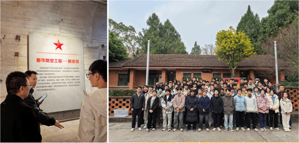 12月18日,实习队伍前往中国两弹城防空洞,开展科学报国红色精神教育与地下防护工程专业认知活动。在两弹城讲解员的带领下,同学们首先重温了“两弹一星”精神的诞生历程,聆听了老一辈科研工作者隐姓埋名、为国奉献的感人故事,接受了深刻的红色精神洗礼。随后,实习队老师在防空洞现场详细介绍了地下防护工程的军民分类分级、结构特点、通风水电设计及防护功能,讲解了其在国防事业、核工业安全及保障人民生命财产安全中的重要作用。同学们零距离观察防空洞的主体结构、通风系统、其内多种防护工程模型等,跟随老师了解地下防护工程的抗冲击、防辐射、防渗透等技术要求。此次活动将红色教育与专业认知深度融合,让同学们既坚定了科学报国的理想信念,也明晰了地下防护工程领域的专业价值与使命担当。