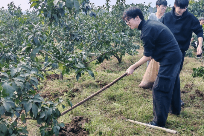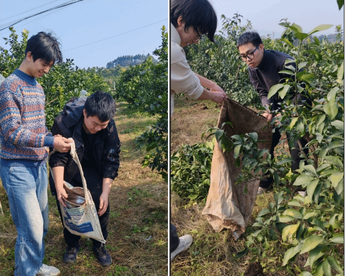在下午乡村劳动实践环节,师生们来到了庙稿村大坪生态果园。在当地有名的“橘子孃孃”陈英阿姨的指导下,开展果树施肥劳动。虽然菜籽油渣和羊粪气味刺鼻,但同学们毫不在意,干得热火朝天,充分体现了西石油学子不怕脏不怕苦的实干精神。劳动结束后,大家一边亲手采摘果园里的橘子,品尝甘甜果实;一边听带队老师讲解大坪果园出露的凉水井组地层,分析橘子甘甜的成长密码。巧妙地将地质实习与实践育人融合,让学生深刻体会到“一分耕耘,一分收获”的人生哲理,更感受到劳动创造价值、实干成就梦想的深刻内涵。