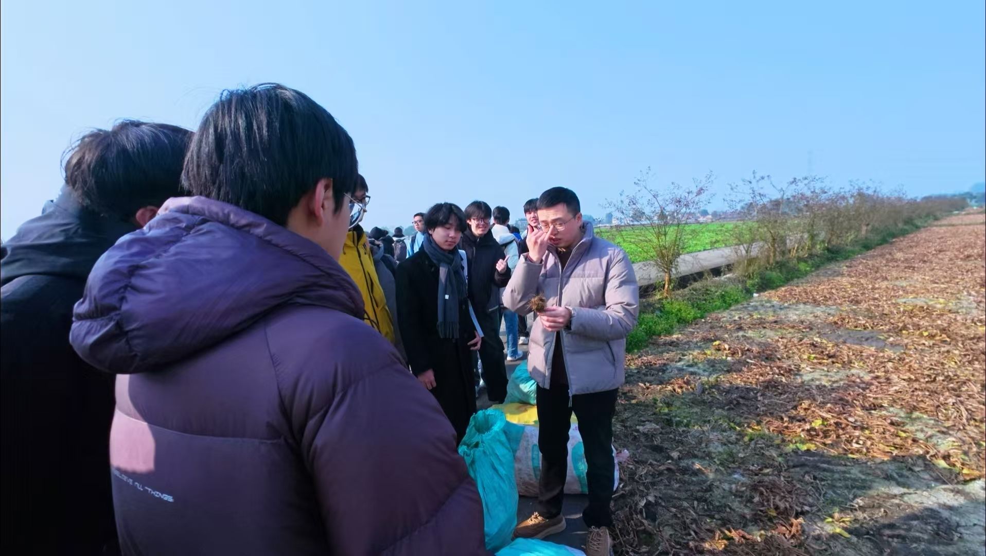 随后桂花桥镇副镇长马涛带领师生们一同走入农田,讲解中药材泽泻的乡村致富故事,讲解3-10月种水稻,10~2月种泽泻的“稻药轮作”创新思路,该创新思路既保障了农民增收,又兼顾了粮食红线,加深了同学们对乡村特色产业的理解,真切感受到产业振兴为乡村带来的蓬勃生机。