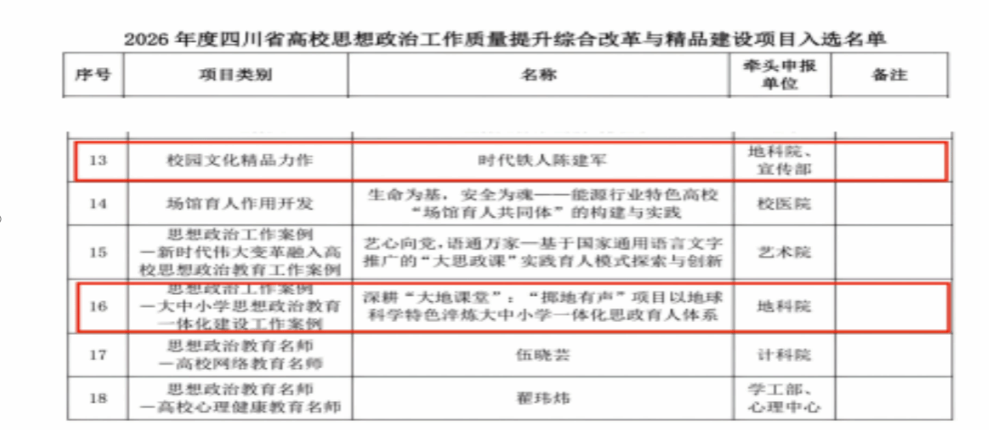 下一步,学院将以此次立项为契机,持续强化思政引领、深化品牌打造、细化项目实施,全力推进立项项目高质量建设、高标准落地、高水平推广,不断把地学特色、行业精神、育人实践转化为思政育人实效,持续推出更多有温度、有深度、有力度的思政精品,全面提升学院思想政治工作质量与育人水平。(图文/刘杨洁雅)