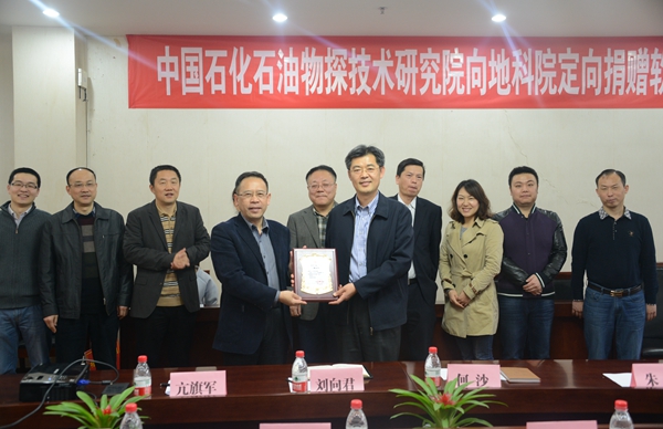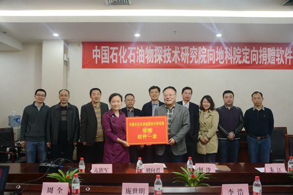 中国石化石油物探技术研究院地球物理软件所所长庞世明,高级工程师汪彩云、周全,地科院党委书记朱江,地科院院长刘向君,地科院教师代表,校友总会、教育发展基金会工作人员参加了捐赠仪式。(李阳)