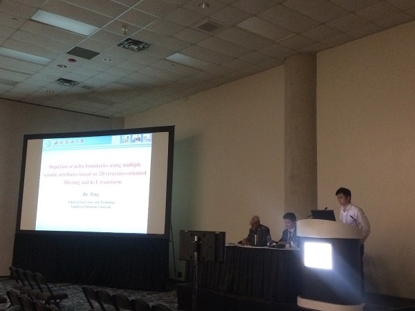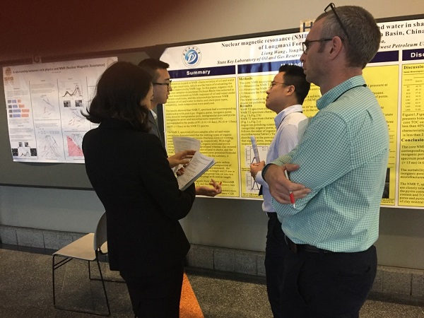 地科院教师王亮、博士生彭达、硕士生付永红参加了本次会议,并作了相应报告。其中,博士生彭达做了“基于二维结构导向滤波和K-L变换地震多属性的三角洲边界识别”的oral演讲,王亮老师、硕士生付永红做了题为“中国四川盆地东南部龙马溪组页岩油水核磁共振响应特征”的poster展示,受到了国内外同行学者的广泛关注。