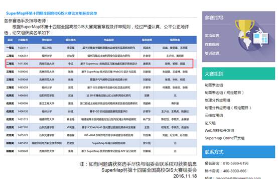 我院地理信息科学专业2013级学生代表队(李红、胡奇、杨柳、郭超)在唐章英老师的指导下获得了第十四届全国高校SuperMap杯GIS大赛二等奖的好成绩。本届全国高校GIS大赛也吸引了四川省内的其他高校参加,西南科技大学获得了地理分析组三等奖一项;成都理工大学获得了地理分析组优秀奖一项。