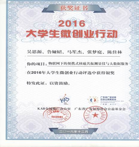 12月19日,“2016年大学生微创业行动”成果发布会暨大学生微创业论坛在中央财经大学举办,并举行2016年大学生微创业获奖项目颁奖仪式。由我院学生(吴思源、马笙杰、陈佳林)和经管院学生(鲁娅珺、张梦庭)共同完成的项目——“物联网下的便携式核磁共振测量仪与大数据服务”荣获全国银奖。四川省共有3所高校在此次活动中获奖,除我校外,其余获奖学生来自四川大学和西南民族大学。