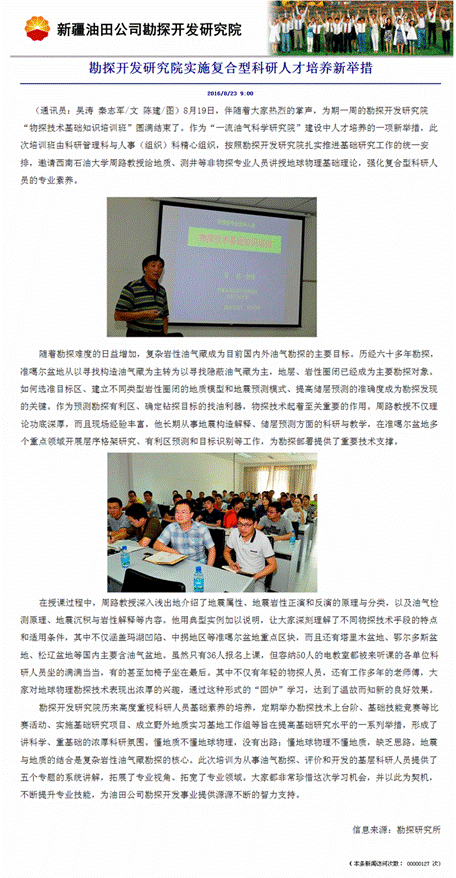 新疆油田勘探开发研究院出于培养复合型科研人才,加强非物探专业技术人员对物探相关基础知识的了解与学习,提升综合研究水平的愿望,特邀请我院周路教授在克拉玛依市新疆油田勘探开发研究院结合准噶尔盆地具体实例针对非物探专业技术人员举办为期一周(2016年8月15日—2016年8月19日)的物探技术培训班。周路教授在五个半天的讲课时间内分为5个专题围绕地震岩性解释、储层预测与油气检测等基础知识,并结合准噶尔盆地具体实例、地震地质结合案例进行讲解,参加培训人员为油田勘探开发研究院各个研究所相关人员达50余人,培训效果受到了各位学员的普遍好评,创研究院培训参加人数多、坚持时间长的记录,堂堂课参加人数爆满,许多学员都是在繁忙的科研和生产研究任务中挤出时间坚持参加听课!油田研究院对该次培训非常重视,专门做了培训宣传和相关通知,事后对培训效果也进行了问卷调查(见图1),油田网站上先后三次做了相关新闻报道(图2)。周路教授该暑假还应新疆油田采气一厂的邀请也进行了专题讲座。