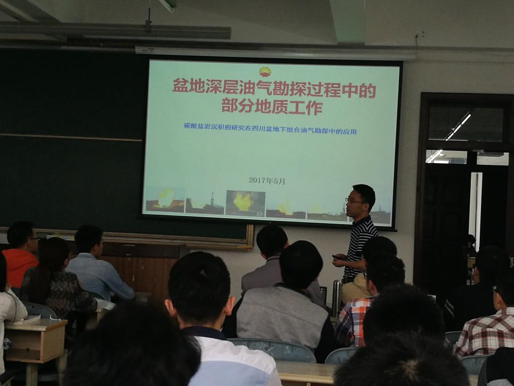 5月5日,资源勘查工程2015级一班《沉积岩与沉积相》课堂迎来了来自中石油西南油气田分公司勘探开发研究院油气所所长——罗冰博士的精彩一课。课堂上,罗冰博士紧密结合沉积相在油气勘探中的实际应用主题,分享了就他和他的团队在四川盆地下寒武统龙王庙组局限—蒸发台地相颗粒滩勘探的应用实例,解析了在精细勘探开发阶段及区域勘探阶段的沉积相工作思路和研究重心,特别强调了地质思维与地质模型建立前提下钻井、测井、地震联动的沉积相综合分析的重要性。