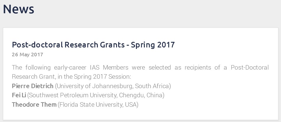 近日,从国际沉积学家协会(IAS)官网获悉,我院青年教师李飞博士获得2017年度春季博士后研究基金(Post-doctoral Research Grants)。该项基金在全球范围内每年资助2批次,每批次不超过4名青年科技人员从事沉积学领域的创新研究工作。