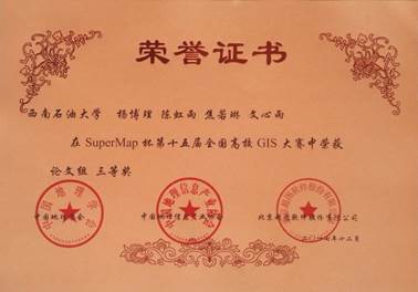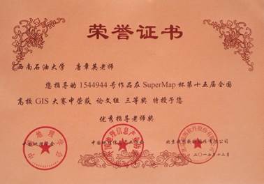 本次大赛,参赛作品取材广泛,涵盖共享单车、古树巡护、出行安全、智慧校园、景区监测、水情观测、一带一路服务、生活服务等众多GIS应用领域。我校地理信息科学专业2015级学生代表队(杨博理、陈虹雨、焦若琳、文心雨)获得论文组三等奖一项,唐章英老师获得优秀指导教师奖。省内高校除我校外,仅四川农业大学获三维应用组三等奖一项。