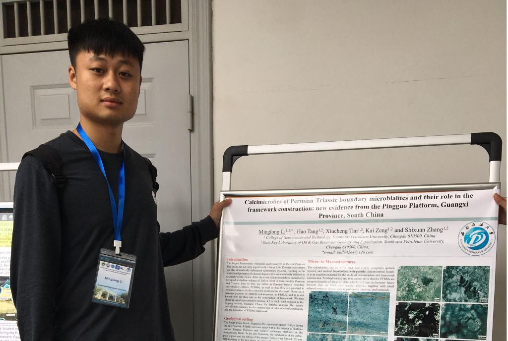 我院谭秀成教授团队硕士研究生李明隆于2018年5月22日-24日参加了在中国地质大学(武汉)国际会议中心举行的国际地球科学计划630:深时极端气候环境与生物响应国际研讨会(IGCP630:International Symposium on Deep-time Environmental & Climatic Extremes and Biotic Responses)。会议由IGCP630:二叠-三叠纪极端气候与环境、联合国科学、教育及文化组织(UNSECO)、国际地质科学联盟(IGU)、国际地球科学计划(IGCP)总部、IGCP中国委员会、中国地质大学(武汉)主办,由中国地质大学(武汉)承办。李明隆硕士作题为《Calcimicrobes of Permian-Triassic boundary microbialites and their role in the framework construction: new evidence from the Pingguo Platform, Guangxi Province, South China》的海报展示与交流,并获参会同行一致好评。