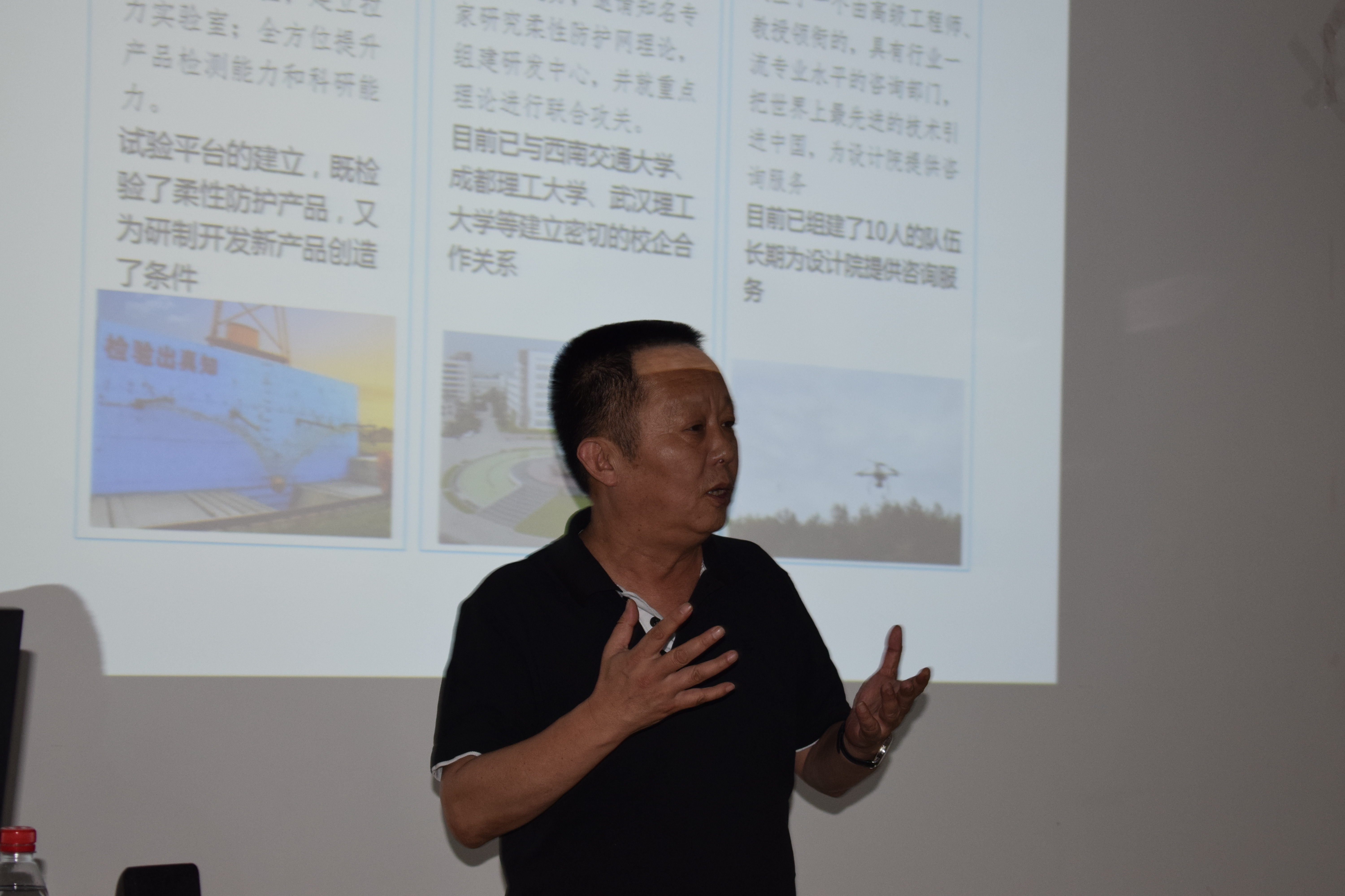 报告之初,吕汉川董事长向大家介绍了关于国内外柔性防护的发展历史,为掌握行业整体发展状况,吕总深入欧洲、日本等地调研,并翻译了《欧盟ETAG027标准》等重要文献,指出柔性防护已成为世界各国边坡治理的主要技术手段。同时总结了我国与国外存在差距与落后的原因,主要包括防护理念、防护能级的差异以及缺少行业科研、标准、监管等。通过国内外设计工作余量的对比指出行业乱象和隐患危害,针对这一问题,提出了相应的应对措施,自建三大平台推动行业发展,通过落石冲击试验平台和Rockfall落石分析软件、CRSP-3D三维落石分析等软件开发引导网和拦截网等柔性防护产品,并成功应用于工程实际。讲述了帘式防护网研发过程,多次进行帘式网崩塌试验,利用工程案例来展示帘式网的工作特性及优点。最后,吕汉川董事长重点提到行业规范问题,希望柔性防护技术坚决执行国家标准,不断向前发展。
