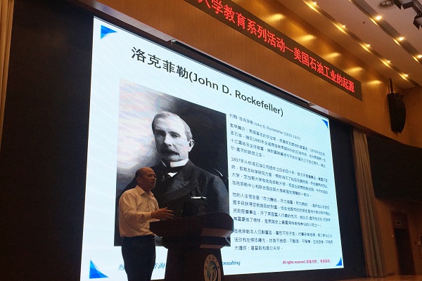 讲座进行过程中,刘牧老师首先对石油行业现状及美国的油气聚集分部地区进行了简单概括。其后,他分别就石油工业重心从早期的宾夕法尼亚,到中期迁移后的奥克拉荷马,再到后来的成熟时期的德克萨斯这三个转移点,向大家介绍美国石油工业的发展与演变。他介绍到,人们最早开始认识到石油大量存在于地底之后,便争相加入到石油勘探开发之中去,但是由于技术缺陷,出现了很多盲目性和偶然性的问题,这些问题在促进石油工业推广的同时也使得石油工业难以继续发展。在奥克拉荷马时期,人们开始注重石油勘探的科学性研究,且在此期间出现了石油地质学理论。在科技的帮助下,美国石油工业进入了一个高速发展时期,石油行业演变成了一项十分专业化的领域。到了发展后期,在美国政府法规的宏观调配与支持下,美国石油行业不断成熟完善,最终形成现在的发展体系。