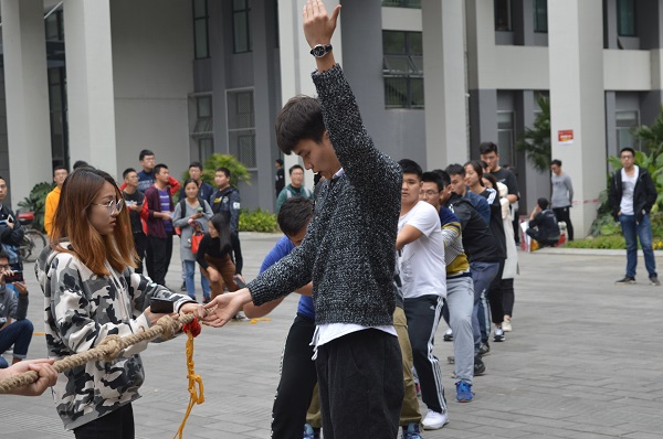 此次比赛以各年级辅导员带的学生为单位,共组成八支队伍,每队十人,男生七人,女生三人。比赛实行淘汰制晋级方式,三局两胜制,抽签分组决定比赛顺序。随着比赛哨声的响起,队员们口中一起高呼着“一二,一二”,双手紧握长绳,憋足了劲的往后拉。其他没有参加比赛的同学们自发的组成啦啦队为自己队的队员加油,号子声、呐喊声,此起彼伏。裁判们依据公平的比赛原则,参赛人员们本着“友谊第一,比赛第二”的原则,整场比赛有序进行。最终经过耐力、体力的较量,由李明科老师率领的17级本科生获得冠军。