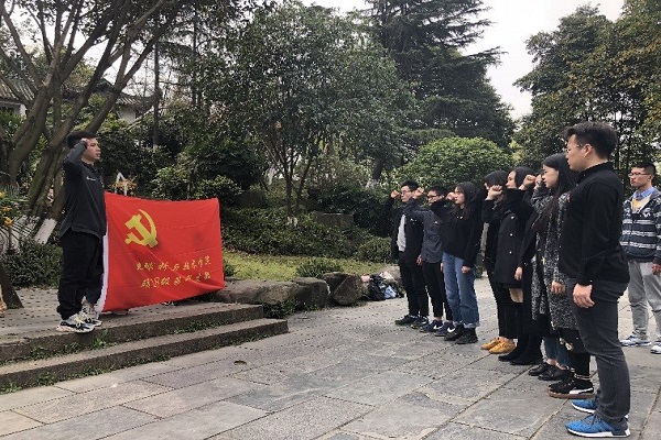 首先党支部全体成员及入党志愿者整齐列队,庄严肃穆,学生党员车正强同志为大家宣读王铭章将军的光荣事迹,学习他的的革命精神。在烈士纪念碑下,党支部书记张惊喆同志念哀悼词,全体默哀一分钟。接着,同志们手持鲜花,排起了一条长长的队伍,向王铭章将军的墓碑献上鲜花并鞠躬致敬,深切表达对革命烈士的敬仰与缅怀。最后,由张惊喆同志带领大家重温入党誓词,不忘初心、牢记使命,认真学习党的路线、方针、政策,认真履行党员义务,努力拼搏,艰苦奋斗,充分发挥共产党员的先锋模范作用,为一旁观摩的入党志愿者同志们树立了良好的榜样,用行动体现党员的先进性,通过实践真正去感悟革命精神。