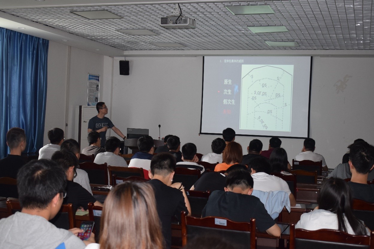 报告中,鲁老师首先为我们介绍包裹体的基本概念以及目前对包裹体几种可能成因的介绍。随后,为同学们讲述了包裹体在油气勘探领域的应用。鲁老师说,目前包裹体在地质各领域的运用十分广泛,包裹体的研究是当下油气勘探中不可缺少的手段,并鼓励同学们投身于该方面的研究。在座的同学们目不转睛的听着鲁老师的介绍,交流完毕后,同学们一一提出了自己的问题,最后鲁老师就同学们的问题对三相流体包裹体和纯液相流体包裹体的解释以及如何对均一温度进行压力校正再一次做了详细解释。