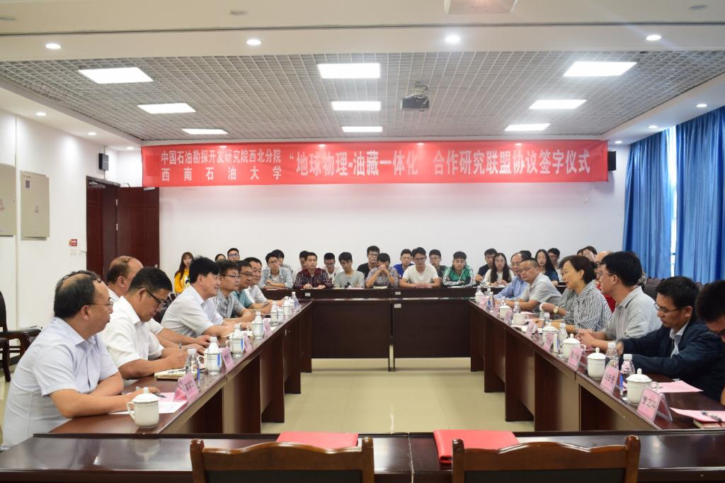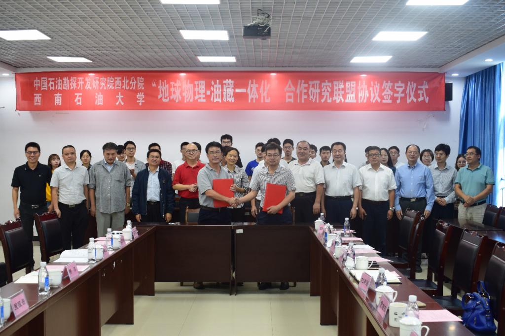 2019年9月5日下午,中国石油勘探开发研究院西北分院院长杨杰、副院长雍学善、西北分院副总工程师关银录、副主任雷振宇、西北分院地球物理所所长杨午阳、油气所书记谭开俊以及西北分院地球物理所副所长周春雷等一行莅临我校,就中国石油勘探开发研究院西北分院与西南石油大学 “地球物理-油藏一体化”合作研究联盟举行了签约仪式。会议在明辨楼D404举行。