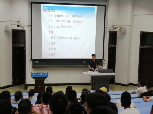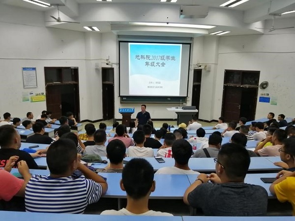 2019年9月1号晚上19:00,17级资源勘查工程和地质专业在思学楼B110阶梯教室开展了新学期的年级大会暨实习动员大会。本次会议由17级年级主席周力同学进行主持。本次会议旨在勉励同学在新学期继续前行,养成优良的学习习惯,培养浓厚的学习氛围,同时强调野外实习安全问题。