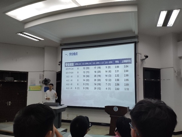 会议以对第二学期的绩点分析为切入点,从日常管理、课堂管理等方面分析了整个年级可能存在的问题,据此王老师提出本学期将做严格管理。首先绩点整个年级整体严重下滑,最明显的表现为高分段同学几乎没有,低分段同学增多,挂科人数增多。按照挂科人次,几乎每人挂科一门。王老师还以自己的大学室友为例,讲述了挂科对人生的影响,强调了好好学习,严格要求自己的重要性。其次英语四六级过级率没有达到预期,虽然通过四级的人有所增加,但六级通过总人数不足30人。