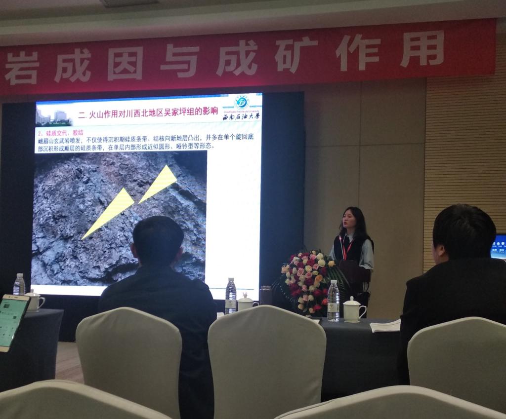 地科院硕士研究生赵金在盆地深部地质作用与深层油气资源分会场发表题为《斑马结构白云岩形成及成储效应——以川西南部中二叠统栖霞组为例》的学术报告,硕士研究生李泯星、王嘉琦、江昱良在火成岩成因与成矿作用分会场分别作《火山作用对碳酸盐岩的影响及其油气地质意义》、《川西南部二叠系火山岩储层特征研究》、《四川盆地蜀南地区二叠系火山岩特征及其油气地质意义研究》的学术报告,并在会后与各位专家进行了交流。我院硕士研究生何顺的论文《川东南丁山地区龙马溪组页岩矿物特征对微观孔隙发育的影响》获中国地质学会2019年学术年会优秀论文奖。