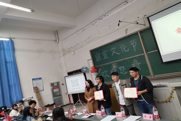 本次共有11个寝室进行答辩展示,展现出他们活跃的思维和创新能力,向现场评委及观众展示了寝室风采。寝室风格多种多样,有的寝室搞怪可爱、有的诗情画意、还有的低调奢华。这些寝室给老师和同学们留下了深刻的印象。在精彩的答辩后,周雅倩老师为此次活动进行了总结。同时,她还强调了寝室建设的重要性与必要性,告诉同学们建设良好的寝室文化对全体同学的学习和生活都有极大的好处。最后通过现场评委打分和线上活动综合评分,确定了获奖寝室名单:一等奖3-327,二等奖12-527和3-325;三等奖12-503、3-317和3-406.周雅倩与曾静红老师为获奖寝室颁发获奖证书。