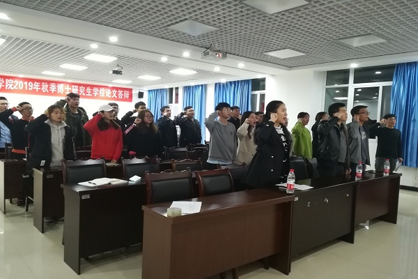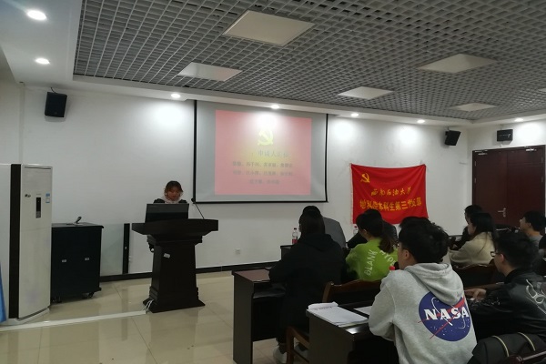 会议开始,全体起立奏唱国歌,随后10名申请人依次汇报对党的认识、本人履历及现实表现,随后,入党介绍人分别发表讲话,指出申请人的优点与不足以及今后努力的方向,并表明是否同意发展其入党。在进行正式党员举手表决并宣读表决决议之后,全体成员面对党旗进行庄严宣誓。党支部副书记姜玖林同志做总结发言,他讲到,刚刚加入支部的同志应该以正式党员的标准严格要求自己,在生活和学习中都应该做到最好,争取成为同学们学习的榜样。