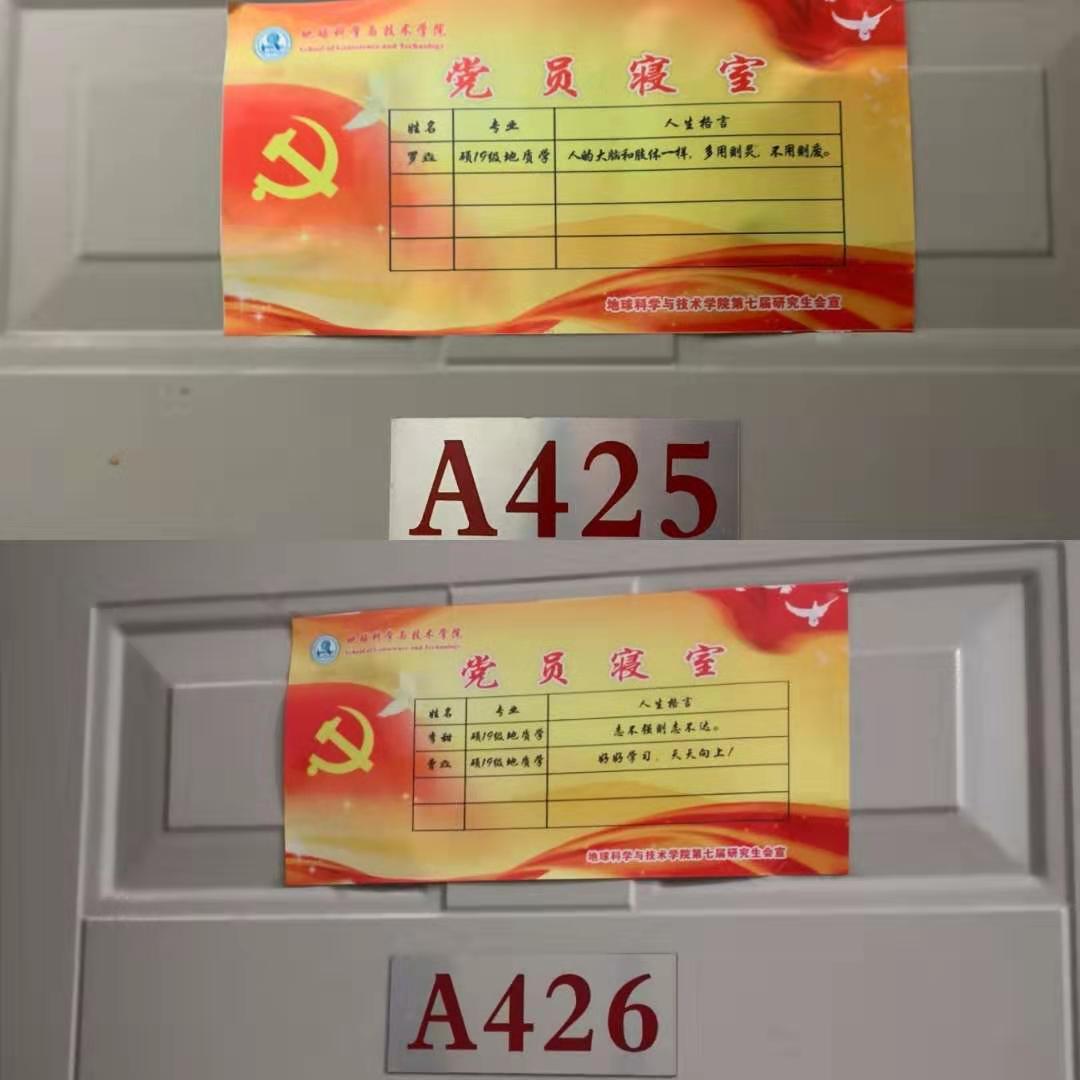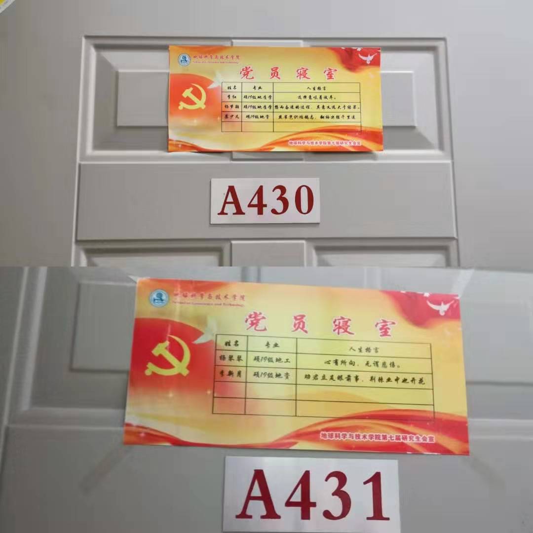本次活动学院要求每名党员同志在自己寝室门上粘贴党员宿舍标签,标签上有每名党员的姓名、专业和人生格言。旨在亮出党员身份,更好地发挥学生党员先进性,增强学生党员党性修养,扩大党在青年大学生中的影响,促进大学生成长成才。对于每个学生党员来说,“党员宿舍”不仅仅是一个荣誉,更是激励和督促,一方面,它对我们学生党员提出了更严格的要求,提醒我们党员要注意自己的言行举止,自觉主动接受同学们的监督,另一方面,它进一步增强了学生党员的责任意识和奉献意识。地质学硕士18级1班蒋华川同学认为,作为学生党员,带领同学们共同创建良好的生活环境,树立榜样是自己义不容辞的责任。“党员宿舍”牌子时刻提醒着大家要牢记党的宗旨,增强党员的角色意识,处处以身作则,接受同学监督。