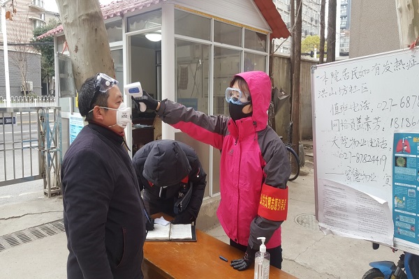 志愿者舒晓燕同学为市民测量体温