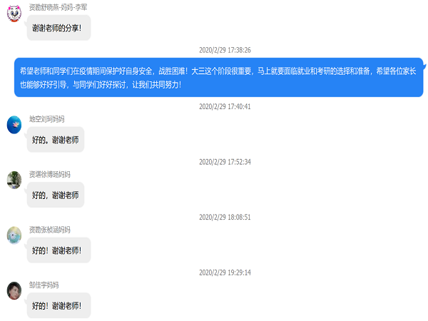 接着,张惊喆老师提到在抗击疫情期间也要为自己的大学及职业生涯做规划,停课不停学,结合自身情况合理安排时间,再次强调了大学英语四、六级过级的重要性,让同学和家长了解到最新的考研和就业形势,就考研复习和就业的准备工作及时间截点提出了自己的建议,并在线解答了学生和家长的相关问题,真正做到 “家校共建,协同育人”。