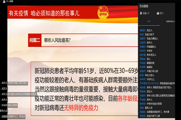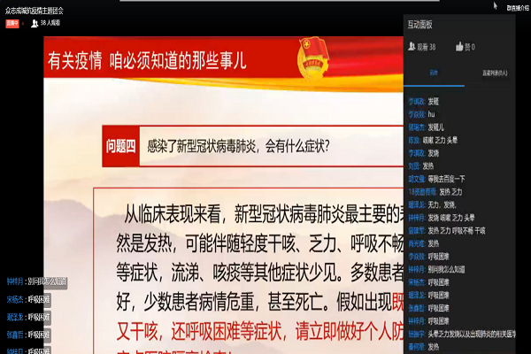 会议上,主持人首先向同学们提出关于新型冠状病毒的热点问题,例如:本次疫情是由什么引发?哪些人群感染风险较大?新型冠状病毒的主要传播途径有哪些?等等。同学们都积极踊跃回答问题,表现了良好的防控意识与社会关注力。之后会议展现了为防控疫情光荣牺牲的公安民警、一直坚守岗位的医护人员等等,同学们由衷感动。会议特别强调防控疫情我们每个人都要参与,不信谣、不传谣,少出门就是为国家做出贡献。