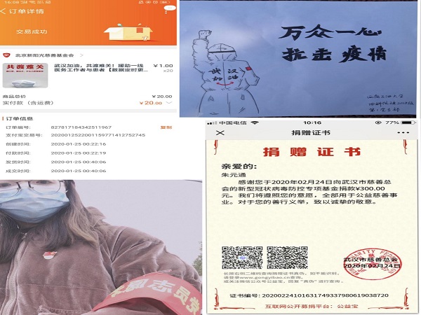 全体党员积极响应党支部的号召,贯彻习近平总书记对疫情防控的重要指示,守初心,担使命;自觉做好居家隔离,做到科学防控;不信谣不传谣,做好党的宣传员。此外,支部党员还积极组织参与各种意义非凡的活动,如:支部党员利用线上平台积极为考研的同学们提供咨询帮助;支部通过线上问卷答题来提升班级同学的防控意识;朱元通、赵易明等同志通过向武汉市慈善总会的新型冠状病毒防控专项基金捐款贡献自己的一份力量;邓羽同志更是积极投入到抗疫工作中,为当地人民群众提供疫情防控志愿服务,发挥了党员先锋模范作用。