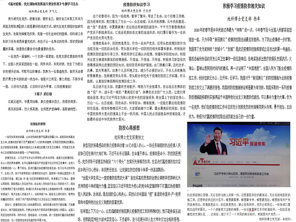 为进一步贯彻落实习近平总书记关于新型冠状病毒肺炎疫情防控工作的重要指示精神,落实学校党委应对疫情防控的工作部署,进一步加强党建引领,发挥学生党支部在防疫控疫工作中的战斗堡垒作用,地科院博士生党支部开展“面对疫情,党支部如何发挥战斗堡垒作用”线上主题教育活动,激发党员同志抗击疫情的精神力量,在这个艰难的时期,与全国人民共克时艰。活动由博士党支部书记林攀主持,党支部全体成员共同参与。