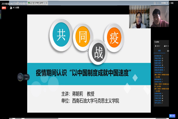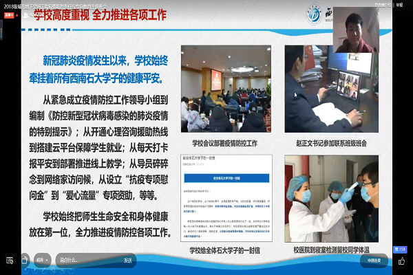 首先,班长郭龙雨关心询问了同学们的近况,并嘱咐大家要多多进行体育锻炼,增强自身体质。接着,“疫情防控典型案例暨疫情防控责任与纪律专项教育”主题班会正式开始。面对疫情,同学们不必恐慌,要学会保护自己,做好自身防护。班长介绍了疫情期间,学校积极响应号召,并采取一系列的措施保证每位师生的平安。然后,班长带领大家学习了《西南石油大学防控新型冠状病毒肺炎疫情期间学生违纪处分补充规定》,并举出实例以加深印象。最后,全体同学共同观看了蒋朝莉教授的公开课。观看完毕后同学们都在消息栏里分享自己的收获与感悟。