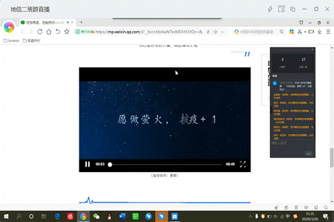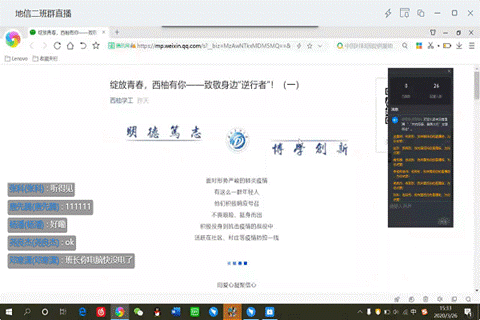通过观看视频这一环节,班长引导同学们要珍爱生命、心系家国,要学习体会疫情中那些闪耀的故事、了不起的英雄和永不磨灭的中国精神。