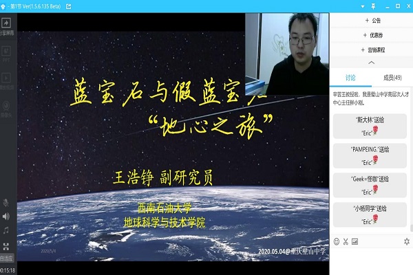 为帮助璧山中学的考生了解本校地科院的学术能力、发展历史以及发展潜能,五月四日19:00地科院副研究员王浩铮线上顺利进行了以学科专业大揭秘——蓝宝石与假蓝宝石的“地心游记”为主题的西南石油大学科普直播活动重庆市璧山中学专场。