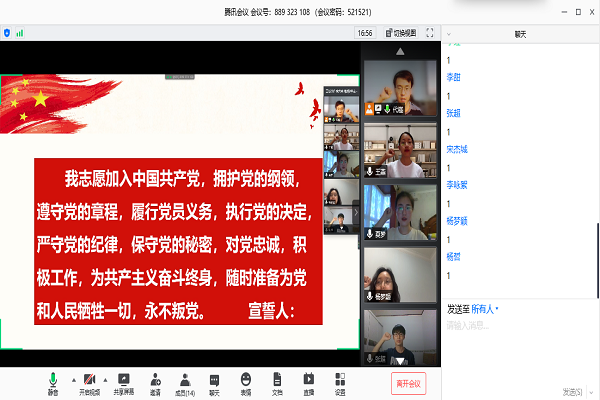 会议最后,代槿同志带领参加本次会议的全体同学线上宣读入党誓词,并对此次线上预备党员接收大会做出总结:一方面强调了全体同志要时刻谨记责任与使命,学习先进人物的优秀品质和伟大精神,充分发挥共产党员的先锋模范作用;另一方面也提醒大家注意身体,面对当下的种种挑战要敢于迎难而上,利用宝贵的时间努力学习,在特殊时期仍然要做好自己的本职工作、有所收获。