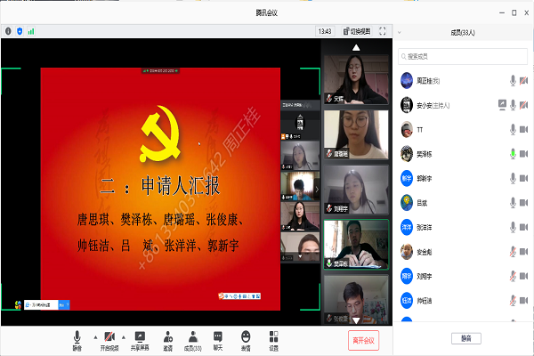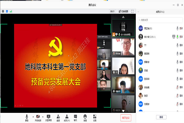 6月4日,地科院本科生第一党支部召开发展预备党员大会,由于疫情原因,会议以网上会议形式进行。本次会议由地科院本科生第一党支部成员安金彪主持,7名正式党员、18名预备党员及8名拟发展党员参加会议。