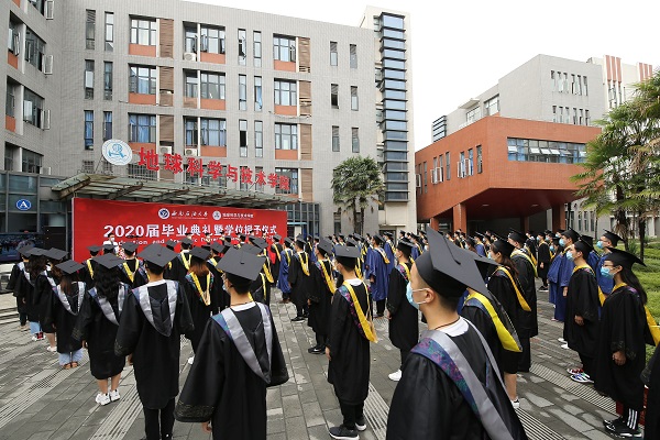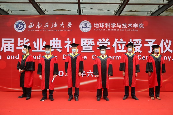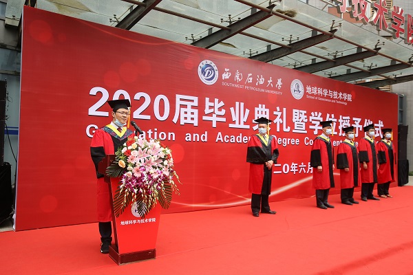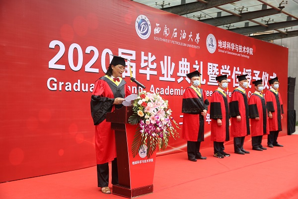 伴随着庄严的国歌声,毕业典礼拉开序幕。首先,由地科院院长黄旭日教授致辞。他祝贺每一位顺利毕业的学子,寄予最真诚的祝福。他希望每位学子,面对未知的未来,需乘风破浪、勇于探索,书写属于自己的美丽人生。同时黄旭日教授也分享了一点自己的看法和建议,给毕业生们点亮一盏前进的明灯。接下来,地科院副院长、四川省学术与技术带头人范翔宇教授宣读《我院获省级和校级2020届优秀毕业生的表彰决定》。紧接着,导师代表、地质学专业负责人郗爱华老师讲话。她被同学们热情地称为“郗妈妈”。郗爱华老师的讲话,让同学们感到一股暖流,同时也充满了动力,将会以更充沛的精力迎接美好未来。郗爱华老师讲话结束后,校友代表朱松柏开始发言。他感谢恩师的谆谆教诲,同时也对即将踏入新的征程的学弟学妹而感到高兴。作为学长,他给学弟学妹分享了一些自己的观点,愿学弟学妹们能翻越道道坎坷,在困难中成长,永葆热情,实现自己的梦想。然后,校级有效毕业生,勘查技术与工程2016级研究班的王琳发言。她十分荣幸能代表2020届的毕业生们进行发言。她代表2020届的毕业生们,感谢这四年来给予他们知识以及品德的学校,给予他们关怀的领导、给予他们启迪的恩施们。同时她也祝愿每一位同学前程似锦,拥有一个美好未来。接下来省级优秀毕业生、国家奖学金、校长奖学金获得者、地质资源与地质工程博士汪尧同学讲话。他讲述了自己的人生经历与日常生活,分享了从中领悟出的人生道理。在场的毕业生们也有些许收获。在领导、老师、学生代表演讲完毕后,毕业典礼也落下帷幕。授位仪式随之举行,学院党委书记朱江、学院教授会主任张哨楠为2020届毕业生代表分开授位。