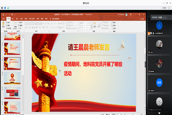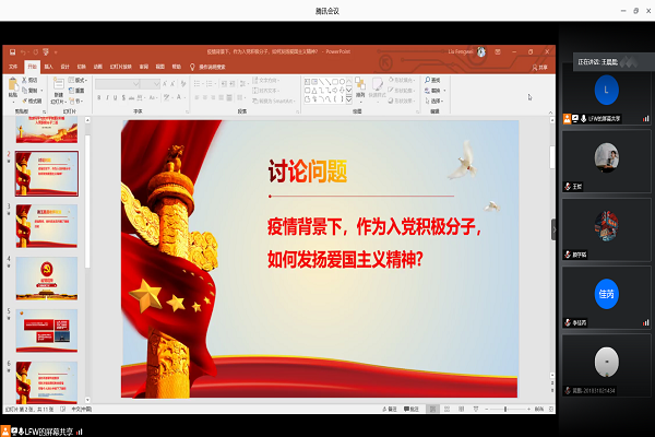 6月21日,地球科学与技术学院第238期入党积极分子2班开展了以疫情背景下,作为入党积极分子,如何发扬爱国主义精神?”为主题线的上讨论活动。本次会议邀请到地科院本科第四党支部书记王晨晨来为大家做分享,2班全体学员均参与了本次主题讨论活动。