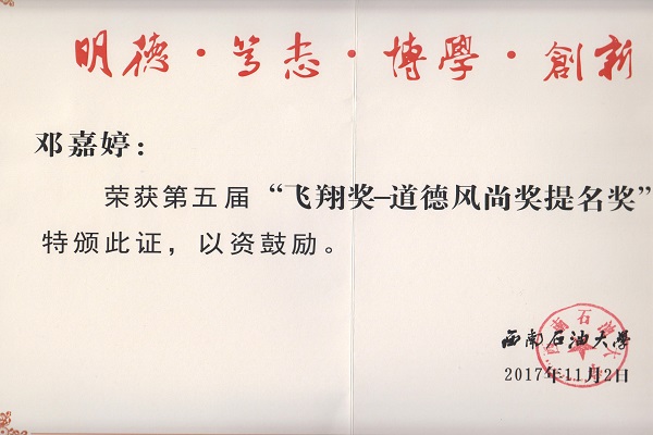 众多的公益活动,让邓嘉婷在大四荣获学校最高荣誉飞翔奖-道德风尚提名奖。即使热心公益,邓嘉婷也没有落下一门课,本科期间一直担任辅导员老师学工助理,党支部策划组组长和班级宣传委员,是教育部中国大学生在线特约通讯员。先后荣获国家励志奖学金3次,校优秀学生一等奖学金3次,二等奖学金4次,首届西南石油大学十佳优秀学生干部称号,优秀学生干部2次,三好学生3次,优秀团员1次,优秀党员2次。四川省优秀毕业生,校优秀毕业生。