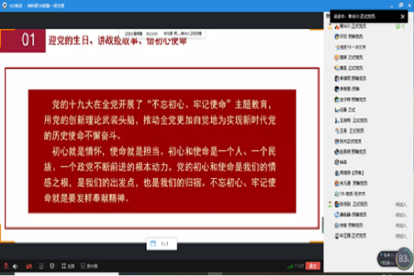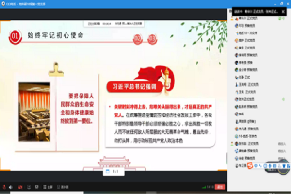 2020年7月6日,为庆祝中国共产党成立99周年,进一步继承和发扬党的优良传统,地球科学与技术学院硕2018级第一党支部以线上会议的形式召开了“迎党生日、讲战疫故事、悟初心使命”专题生活会,学习贯彻党的十九届四中全会精神和2020年全国“两会”精神,交流学习心得,分享战疫故事。会议由支部书记蒋华川同志主持,支部全体党员参加。