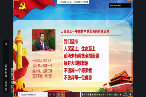 会议伊始,党支书邓嘉婷带领全体党员同志以重温入党誓词的形式为中国共产党庆祝生日。今年是中国共产党99岁生日,我们党始终不改初心,矢志不渝,团结带领全国人民历经千难万险,攻克了一个又一个看似牢不可破的难关,创造了一个又一个彪炳史册的人间奇迹,迎来了实现中华民族伟大复兴的光明前景。随后,会议进入第二部分:讲战役故事。2020年,在突如其来的新冠肺炎疫情面前,全国高校400多万民师生党员,报名在前、战斗在前、引领在前,冲锋在第一线,战斗在最前沿,汇聚起共同抗疫的磅礴伟力。习近平总书记在全国两会上多次提到,我们医疗队成功救治了一位87岁老人的故事,生动诠释了人民至上的治国理念。面对新中国成立以来传播速度最快,感染范围最广,防控难度最大的重大突发公共卫生事件,以习近平同志为核心的党中央一开始就把人民生命安全和身体健康放在第一位,全党上下一心,不遗漏一个感染者,不放弃每一位患者,创造出一个个生命奇迹。最后,支部党员同志重温了自己的初心和使命,始终牢记“永远与人民同呼吸、共命运、心连心”的立场。