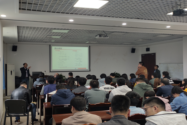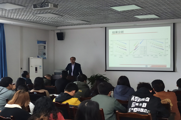 会议伊始,陈雷副教授介绍了韩同城教授的工作经历和已取得的学术成果并表示此次学术交流机会难得,希望大家认真聆听。学术交流会正式开始,韩同城教授首先讲述在不同压力条件下,岩石中裂缝的含量和几何特征的变化会改变岩石的各种物理性质的相关机理。随后,韩教授表示基于岩石声学和电学性质的地球物理勘探方法是进行裂缝探测与识别的最常用方法,二者联合(即声电联合性质)可更全面、准确地对裂缝进行评价。他以含定向排列裂缝人造砂岩为对象,仔细研究了有效压力对各向异性声学和电学性质的影响以及压力变化时各向异性声电性质间的相互联系。在此基础上,韩教授又推导了裂缝含量与几何形状随压力的变化关系,建立了裂缝改变对岩石各向异性声电性质影响的岩石物理模型,并将模型模拟结果与实验数据进行比较,结果良好。报告会最后,韩同城教授对老师和同学们提出的问题进行了一系列解答,并从自己的角度给出了诚恳的指导与建议,本次学术报告会圆满结束。